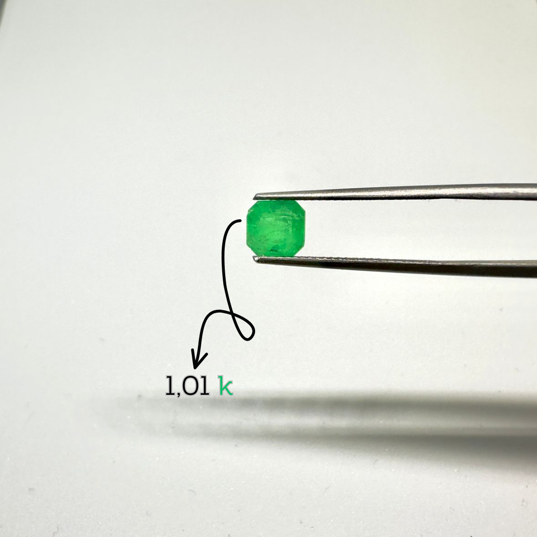 Esmeralda de 1.01 quilates, con aceite natural, sin perma talla cuadrada. Certificada y garantizada por Emporia.